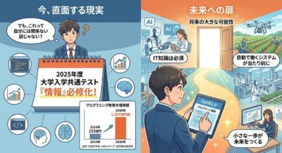 2025年度から、大学入学共通テストに「情報」という科目が必修化されました。プログラミングやデータサイエンス、AIの基礎知識が試験に出るようになったんです(出典:文部科学省)。つまり、IT技術を理解することが、もはや選択ではなく必須になったということです。