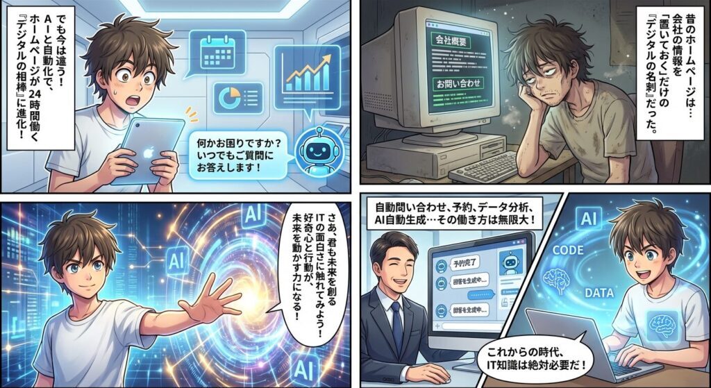 でも実は今、ホームページの世界が大きく変わっています。ただ情報を「置いておくだけ」のページから、24時間365日休まず自動で”はたらく”ホームページへ。AIや自動化技術の進化によって、ホームページが私たちの生活やビジネスを支える「働く相棒」になっているんです。