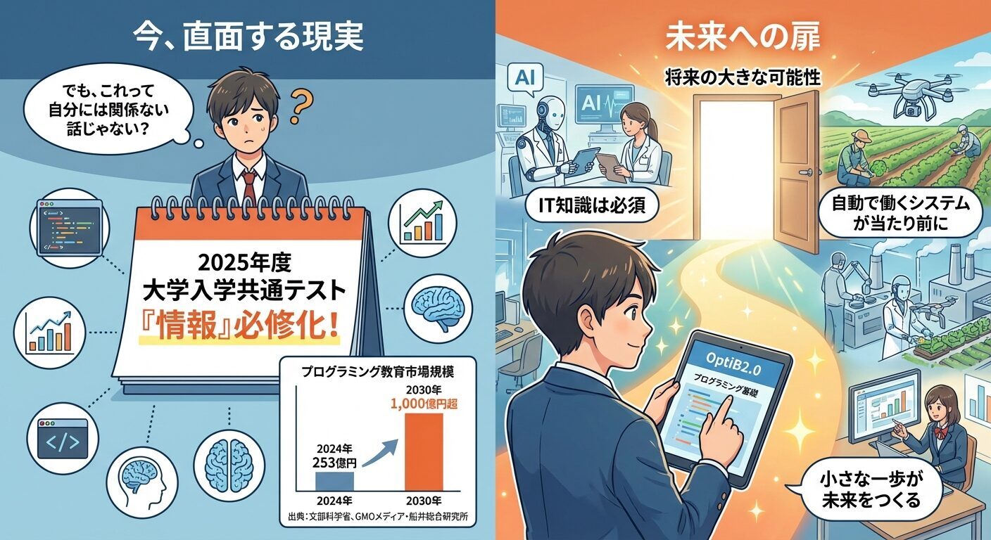 だからこそ、今のうちから最新のツールや技術に触れておくことが大切なんです。OptiB2.0のようなAIツールを実際に使ってみる、プログラミングの基礎を学んでみる、チャットボットがどう動いているのか調べてみる。そういった小さな一歩が、将来の大きな可能性につながっていきます。