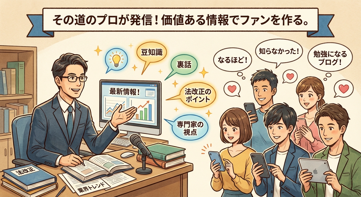 法改正や新しいトレンド、専門家だからこそ知っている裏話など、一般の方が知らない情報は価値があります。「この会社のブログは勉強になる」と思ってもらえれば、定期的に訪問してくれるファンが生まれます。