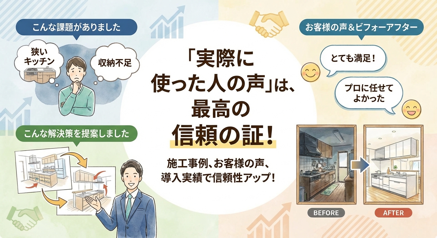 施工事例やお客様の声、導入実績などを紹介する記事は、信頼性アップに効果的です。「こんな課題があったお客様に、こんな解決策を提案しました」というストーリー仕立てにすると、読みやすくなります。