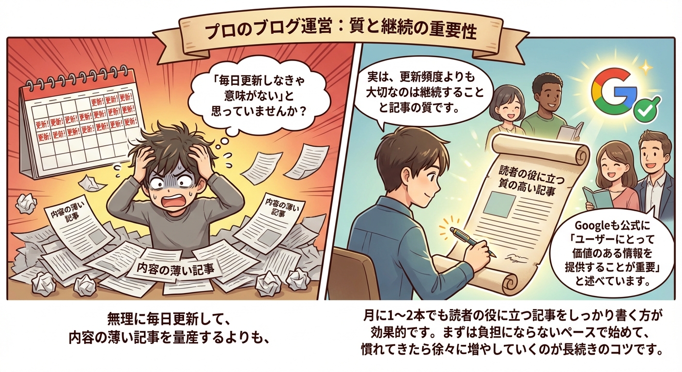 実は、更新頻度よりも大切なのは継続することと記事の質です。Googleも公式に「ユーザーにとって価値のある情報を提供することが重要」と述べています。
