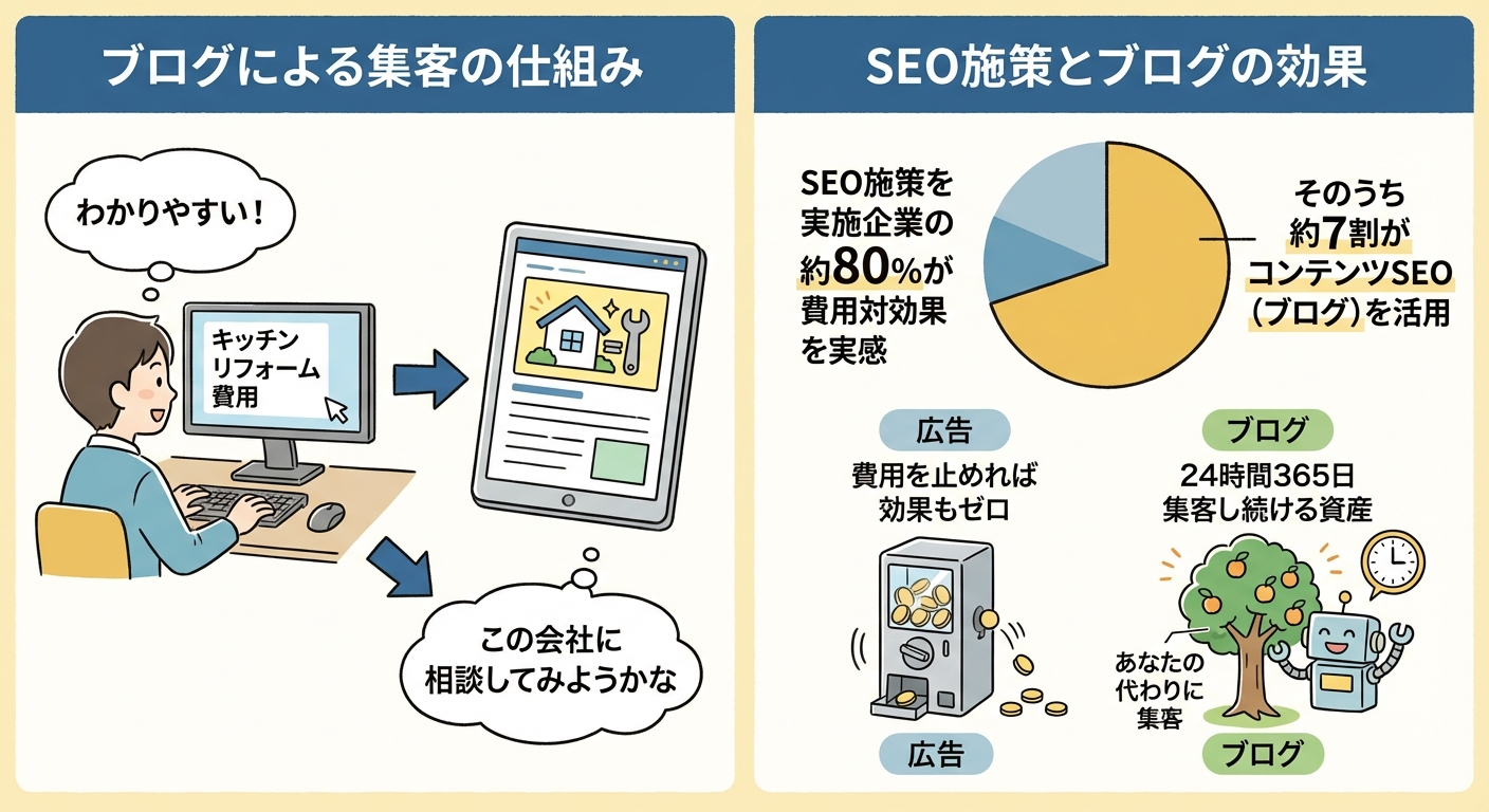広告と違い、ブログは一度書けば長く働いてくれます。広告は費用を止めれば効果もゼロになりますが、ブログ記事は検索結果に残り続け、24時間365日、あなたの代わりに集客してくれるのです。