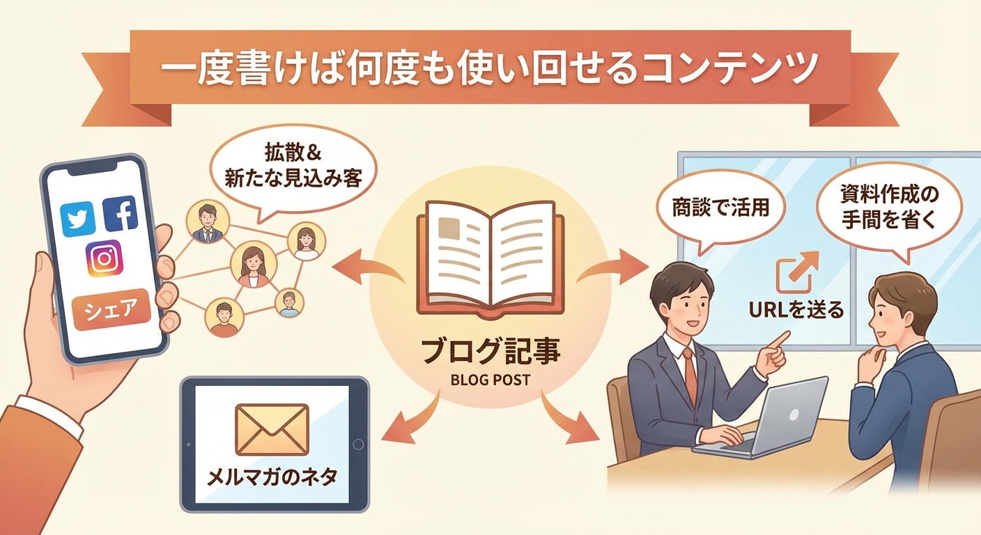 つまり、ブログは「一度書けば何度も使い回せるコンテンツ」として、さまざまな場面で役立つのです。