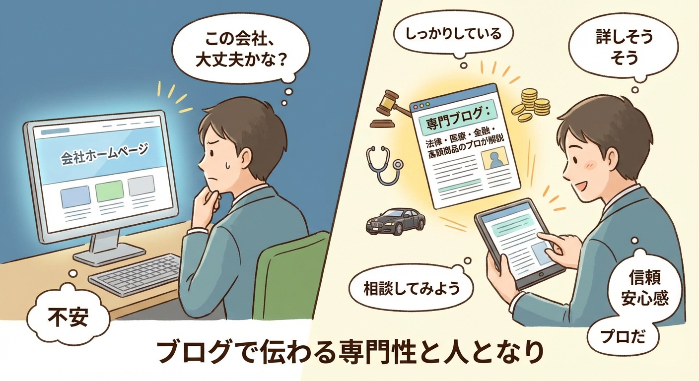 特に、法律・医療・金融・高額商品を扱う業界では、お客様の信頼を獲得することが非常に重要です。ブログを通じて専門知識や実績を発信することで、「この分野のプロだ」という印象を自然に伝えられます。