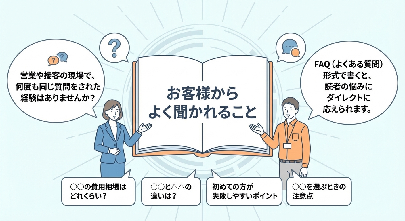 営業や接客の現場で、何度も同じ質問をされた経験はありませんか?それこそが、お客様が本当に知りたい情報です。検索エンジンで調べる人も、同じような疑問を持っている可能性が高いのです。