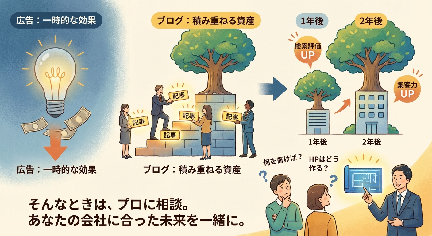 そんなときは、ぜひ一度プロに相談してみてください。あなたの会社に合ったホームページの形や、ブログの活用方法を一緒に考えることができます。