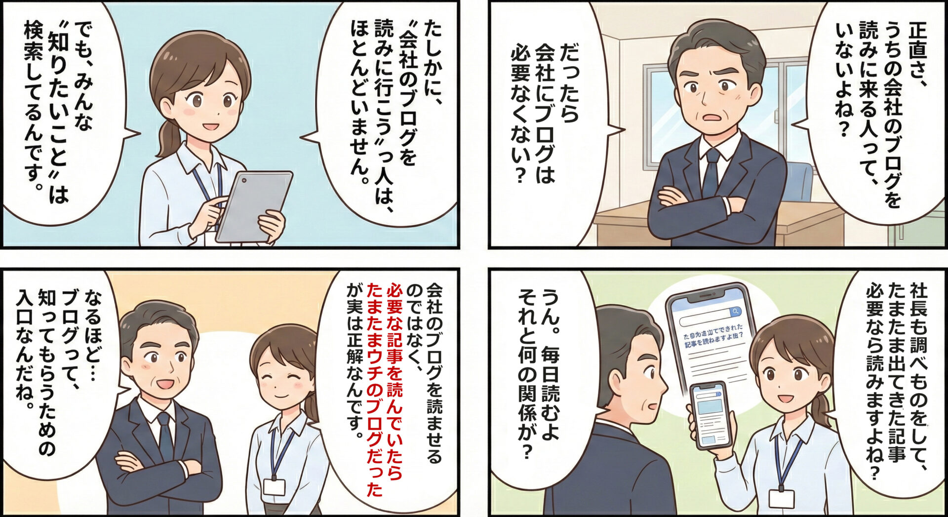 「会社のブログを読みたい」と思って訪問する人は、余程のファンでない限りほぼいません。