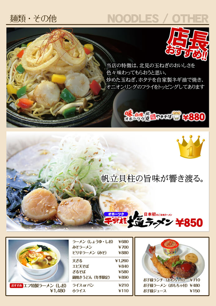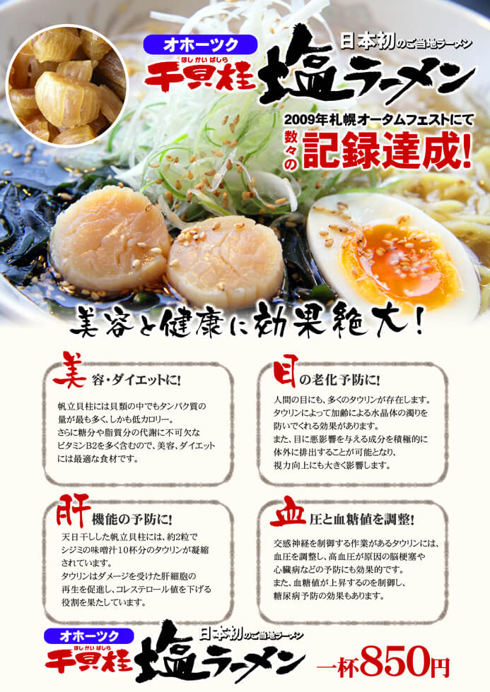 厳選素材にこだわり、「オホーツク干貝柱塩ラーメン」や「黒糖プリン」などオリジナリティーに溢れるメニューでおもてなしいたします。