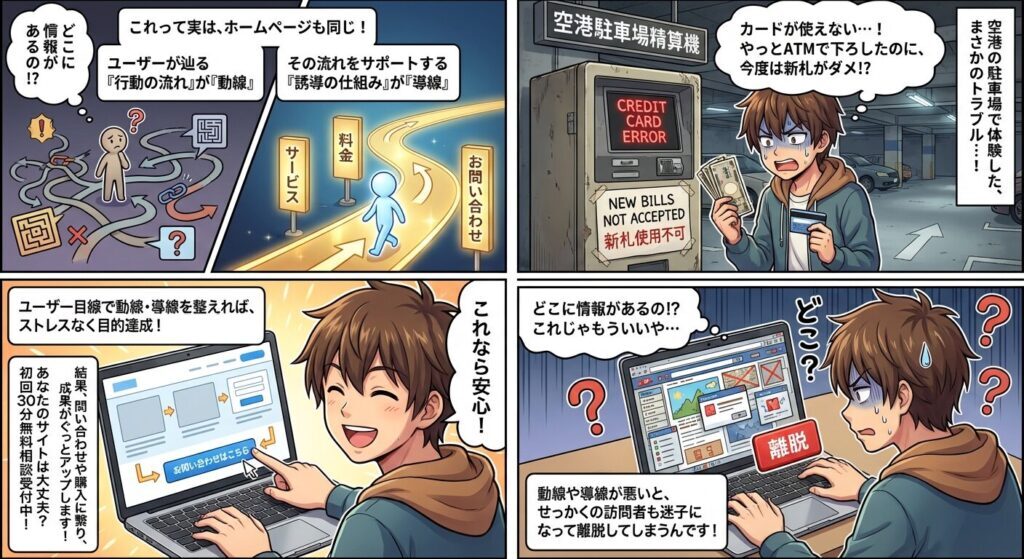 実はこの考え方、ホームページにもそのまま当てはまります。ユーザーがサイト内をスムーズに移動できない(動線)とか、ゴールへうまく誘導されない(導線)といった問題があれば、どんなに良いサービスや商品を提供していても成果が出ません。