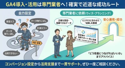 とはいえ、GA4のコンバージョン設定は専門的な知識が必要で、自力での設定にはリスクが伴います。「正しく設定できているか不安」「そもそも何を設定すればいいかわからない」という方は、ぜひ専門家に相談することをおすすめします。