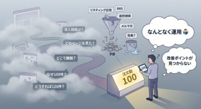 まず、注文に至るまでの「途中経過」がまったく見えなくなります。たとえば、先月は100件の注文があったとしましょう。でも、その100件がどこから来たお客様なのか、どのページを見て購入を決めたのか、途中で離脱した人はどれくらいいるのか。こうした情報がなければ、「なぜ100件だったのか」「どうすれば120件にできるのか」がわかりません。
