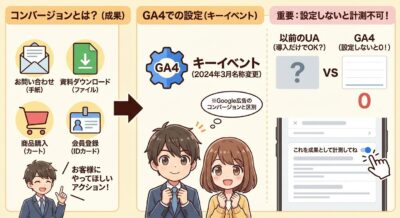 ここで重要なのは、GA4は設定しないとコンバージョンを計測してくれないという点です。以前のユニバーサルアナリティクス(UA)時代とは異なり、GA4を導入しただけでは成果の計測は始まりません。自分で「これを成果として計測してね」と設定してあげる必要があるのです。