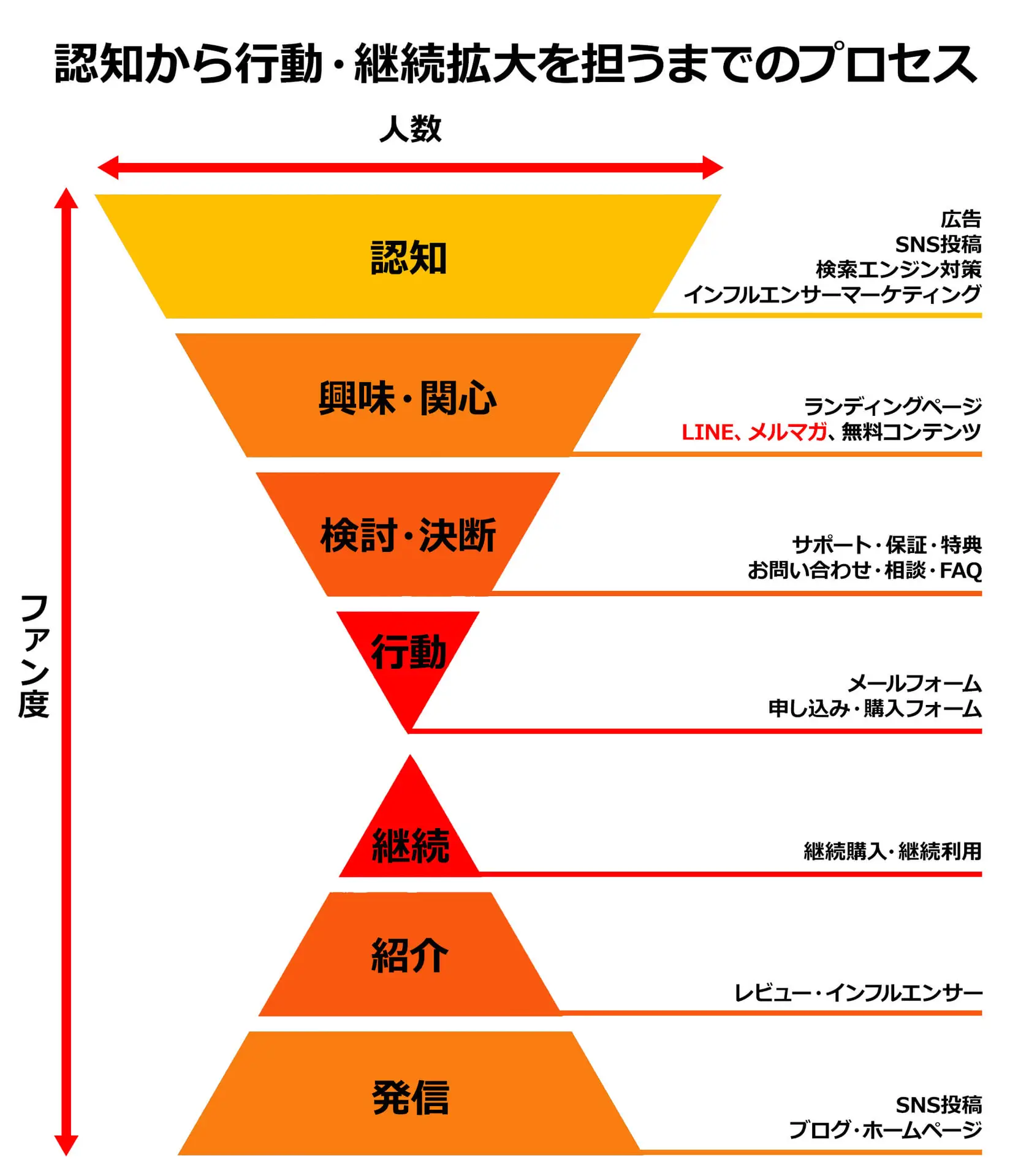 セールスファネルは、「認知」「興味」「検討」「行動」「継続」といった顧客のプロセスを可視化するフレームワークです。この各段階において、メルマガとLINEはそれぞれ異なる役割を果たします。