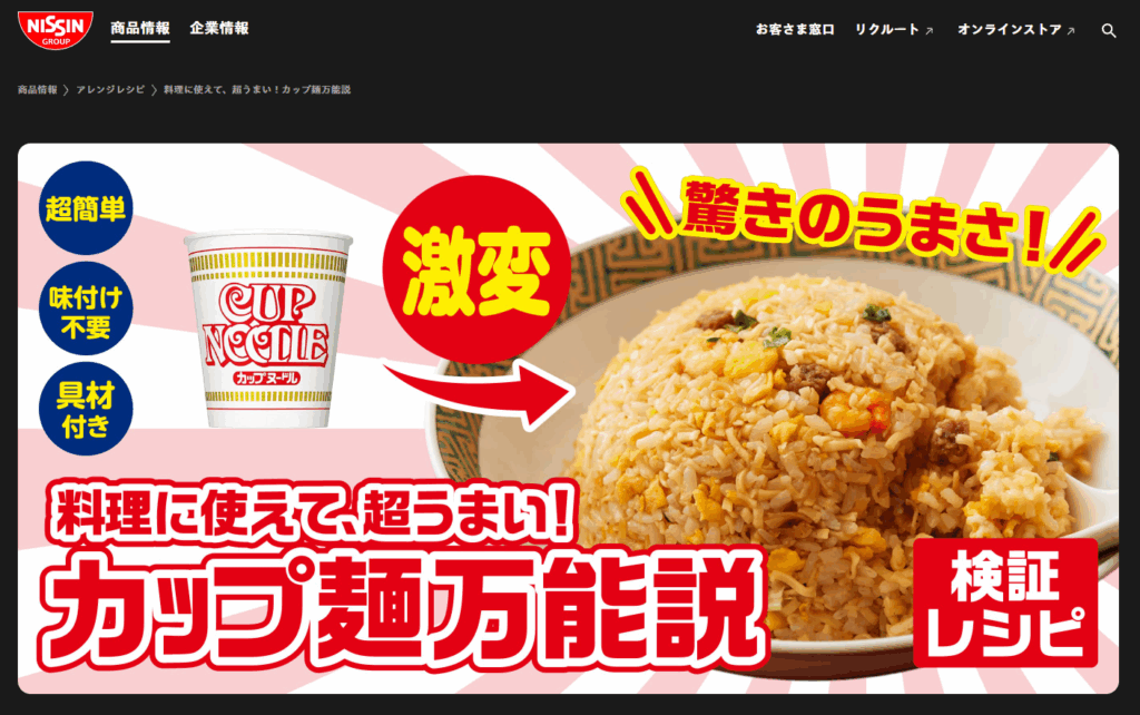 日清といえば、もともとユーモアあふれる広告で知られています。このアレンジレシピも、まさにそのブランドDNAを体現しているもの。「日清=おもしろい」「日清=自由な発想」というブランドイメージを、商品を使った”体験”を通じて自然に再インストールしているのです。