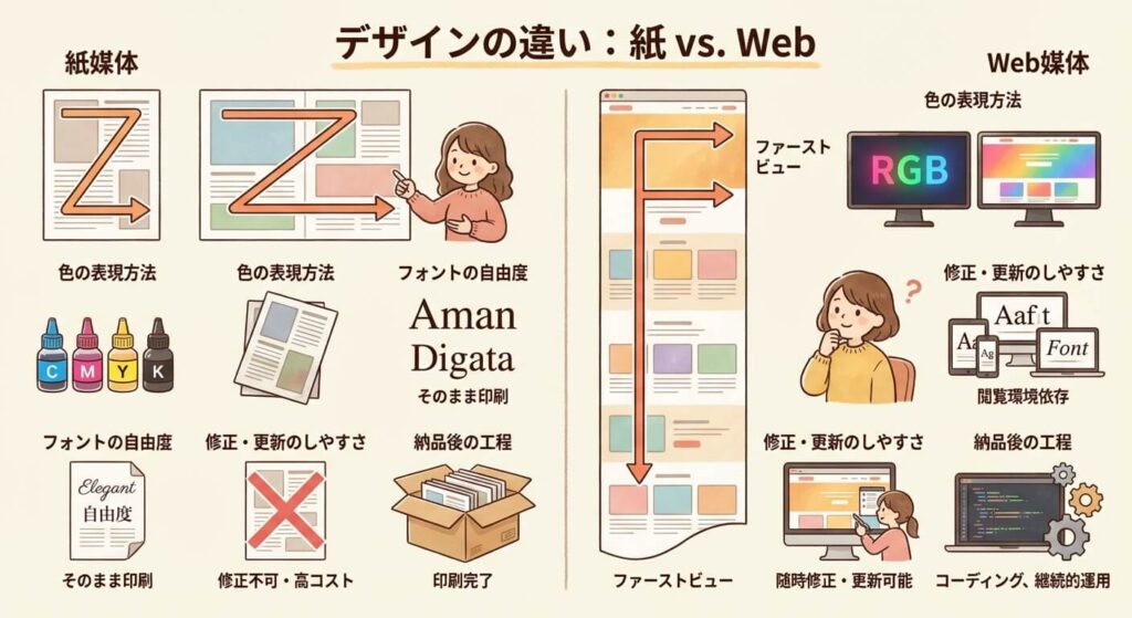 紙媒体では、読者の目線は左上から右下へ「Z」の形に動きます。一方Webは縦スクロールが前提のため、視線は「F」の形に動きます。そのためWebでは、最初に目に入る「ファーストビュー」のデザインが特に重要です。また、紙は決められた用紙サイズ内で情報を整理しますが、Webは縦に長いページも自由に作れるという違いもあります。