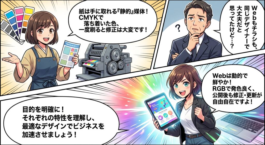 Webと紙媒体のデザインは、視線の動き、色の表現、フォントの制約、修正のしやすさ、納品後の工程など多くの点で異なります。これらの違いを理解し、目的に合った媒体と外注先を選ぶことで、ビジネス成長につながる効果的なデザインを手に入れることができます。