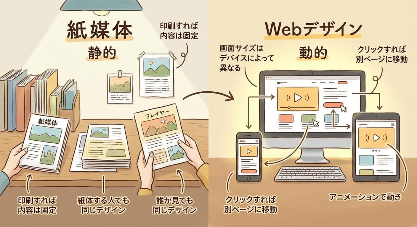一方、Webデザインはパソコンやスマートフォンなどのディスプレイを通じて届けられます。画面サイズはデバイスによって異なり、ボタンをクリックすれば別ページに移動したり、アニメーションで動きをつけたりできる「動的」な媒体です。この根本的な違いが、デザインの考え方や制作プロセスに大きく影響しています。