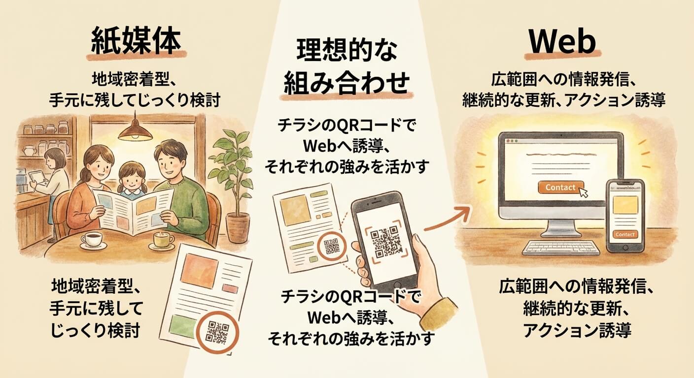 理想は両方の組み合わせです。チラシにQRコードを掲載してWebサイトへ誘導するなど、それぞれの強みを活かした導線設計ができれば、集客効果は大きく高まります。