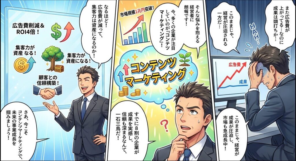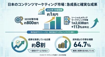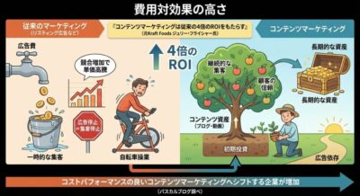 約8割の企業が成果を実感し、6割以上が予算を増額している事実は、その有効性を物語っています。従来広告の4倍のROI、資産として蓄積される集客力、そして顧客との信頼関係構築。これらのメリットは、短期的な売上だけでなく、長期的な企業価値の向上にも直結します。