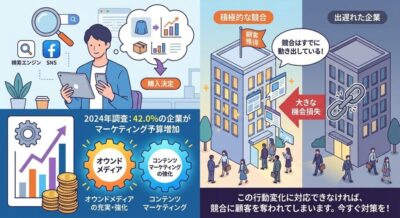 2024年の調査では、42.0%の企業がマーケティング予算を増加させており、その中でも「オウンドメディアの充実・強化」「コンテンツマーケティングの強化」が上位施策として挙げられています(コムエクスポジアム・ジャパン調べ)。競合がすでに動き出している今、出遅れることは大きな機会損失につながるでしょう。