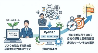 たとえば当社の「OptiB2.0」のように、ブログ記事の作成から顧客管理、メール配信までを一つのプラットフォームで完結できるツールを活用すれば、複数のサービスを契約する手間やコストを抑えながら、効率的にコンテンツマーケティングを運用することが可能です。