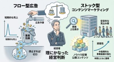 リスティング広告は競合が増えるほど単価が上がり、広告を止めれば集客もストップします。一方、コンテンツマーケティングで作成したブログ記事や動画は、一度公開すれば継続的に顧客を集め続ける「資産」となります。したがって、私は初期投資は必要でも、長期的には広告依存からの脱却につながると考えています。