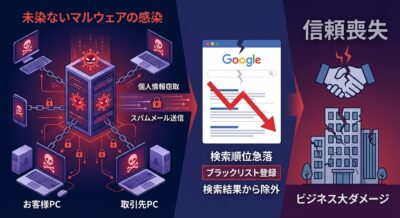 SEO面での影響も深刻です。Googleのブラックリストに登録されると検索順位が急落し、最悪の場合は検索結果から完全に除外されてしまいます。取引先やお客様からの信頼を失い、ビジネスに大きなダメージを与えることは避けられません。